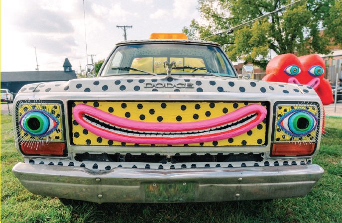 A year later, he followed up Grief Truck with Joyride for Nashville’s Artville Visual Arts Festival. A Dodge pickup truck painted white with black polka dots, Joyride also features sculpted happy faces on the hubcaps and bumper grille, as well as a pile of smiles on the truck bed. The car is functional too. Hunter took it out for Bonnaroo’s Pride Parade in 2024 and, since the sculpted pieces are removable, he can drive it outside of art events as well.