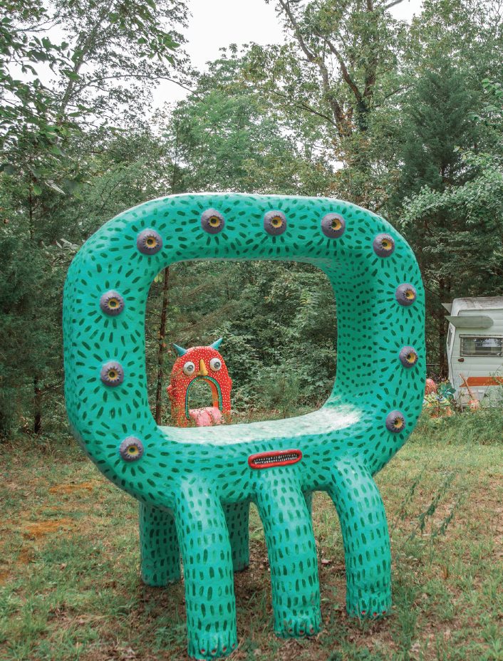 Perhaps the most interactive of Hunter’s installations, though, is the campsite on his property. Hunter refurbished a 1960s Shasta camper, built and painted an outhouse and outdoor shower, and then filled the space with creature sculptures. The menagerie includes some leftovers from Bonnaroo, as well as ones that are site-specific. He’ll rearrange the sculptures when necessary and add new pieces when those on display have sold.
