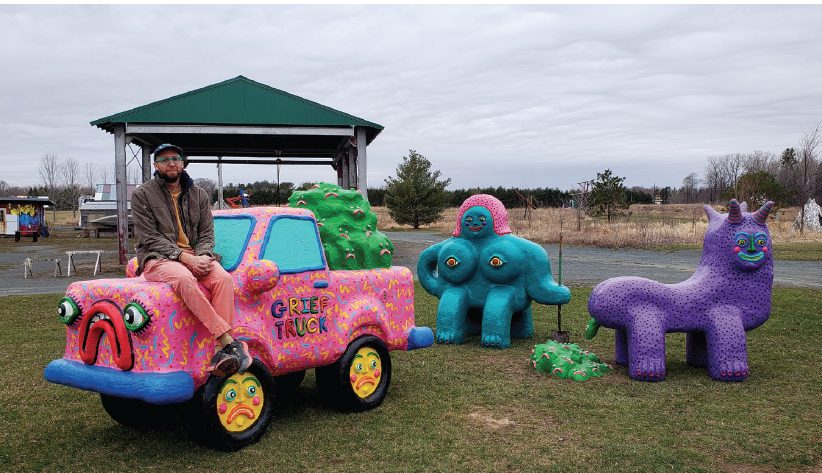 (ABOVE: Grief Truck installation at Franconia Sculpture Park, Schafer MN, 2022 to present. “I made Grief Truck during a month-long residency as a Visiting Artist at Franconia. It was my first time doing any type of program like that… The installation includes a big purple creature shitting all of its sadness into a pile, a Big Momma creature to help scoop it up, and the Grief Truck itself; full of sadness, ready to take it away.”)