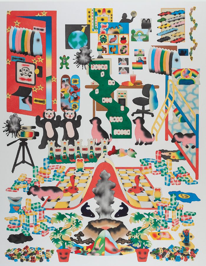 Palladino’s creativity doesn’t end there, as many of his ideas make their way into the material realm as tactile wall reliefs, through resin or hand painted 3-D prints. These might include elements similarly found in his paintings—things like funny felines, rainbow ribbons, and candy-like florals.
