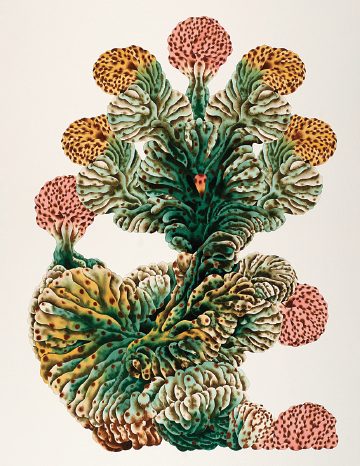 Contrasting Palladino’s bedroom scenes are his distinct botanical portraits, which are acutely textured, yet simultaneously soft and dreamy, all in his characteristic whimsy-psych style. These paintings exalt varieties of the cacti family, their fleshy folds rippling out in hallucinogenic splendor. Palladino and his wife have lived in La Paz for the past five years. Part of the Andes mountain range and the highest capital city in the world, they’ve existed among the incredible abundance of cacti and succulent plants that thrive there. The San Pedro plant—native to the Andes—grows through “cresting,” a response to mutations, infections, or damage that creates a brain-like growth pattern. This plant has become a muse for Palladino. Of this odd and mesmerizing story of growth, he shares, “I began playing at ‘growing,’ or designing, my own versions, and they began to take on an almost spiritual feel, like meeting an old forgotten god, something ancient and wise and mysterious. Then of course the surroundings of this place, the arid mountains, and the sky—which seems very dramatic and close to you— became another frame around the plants.”