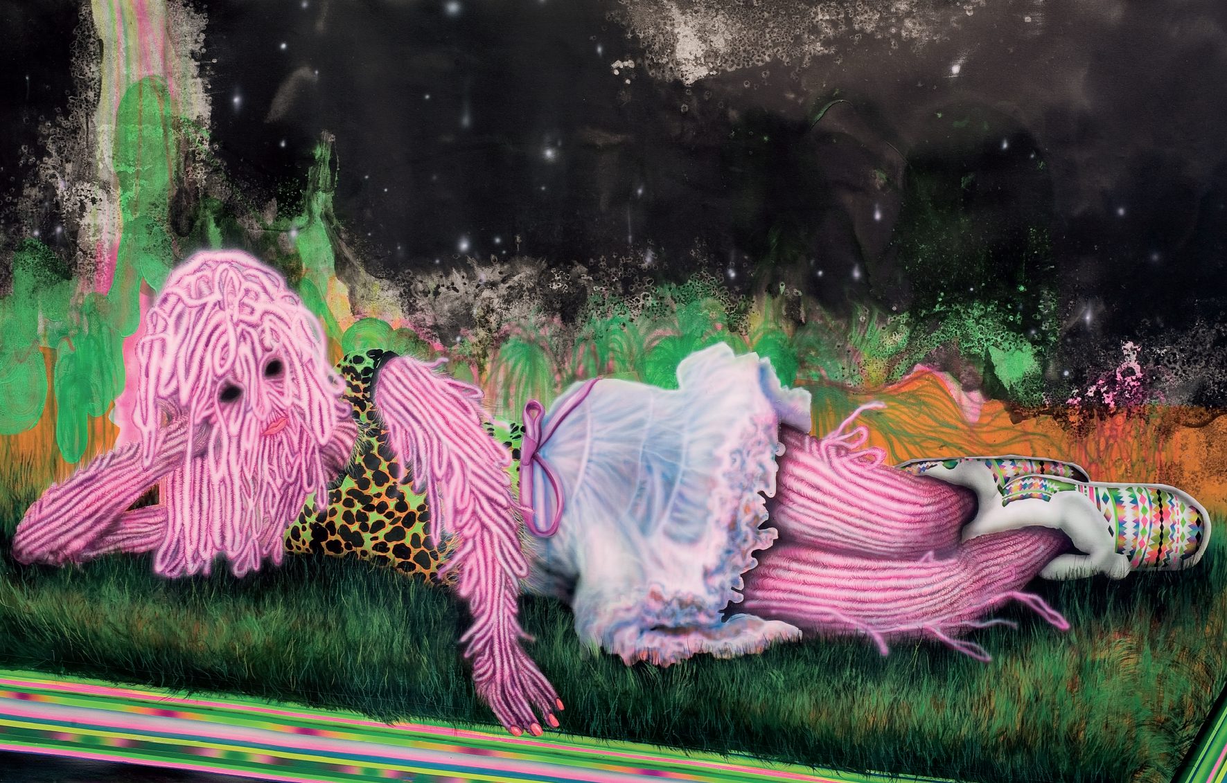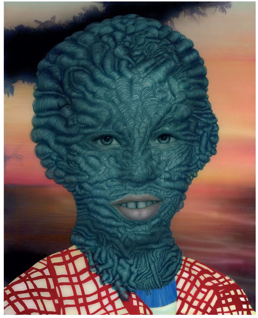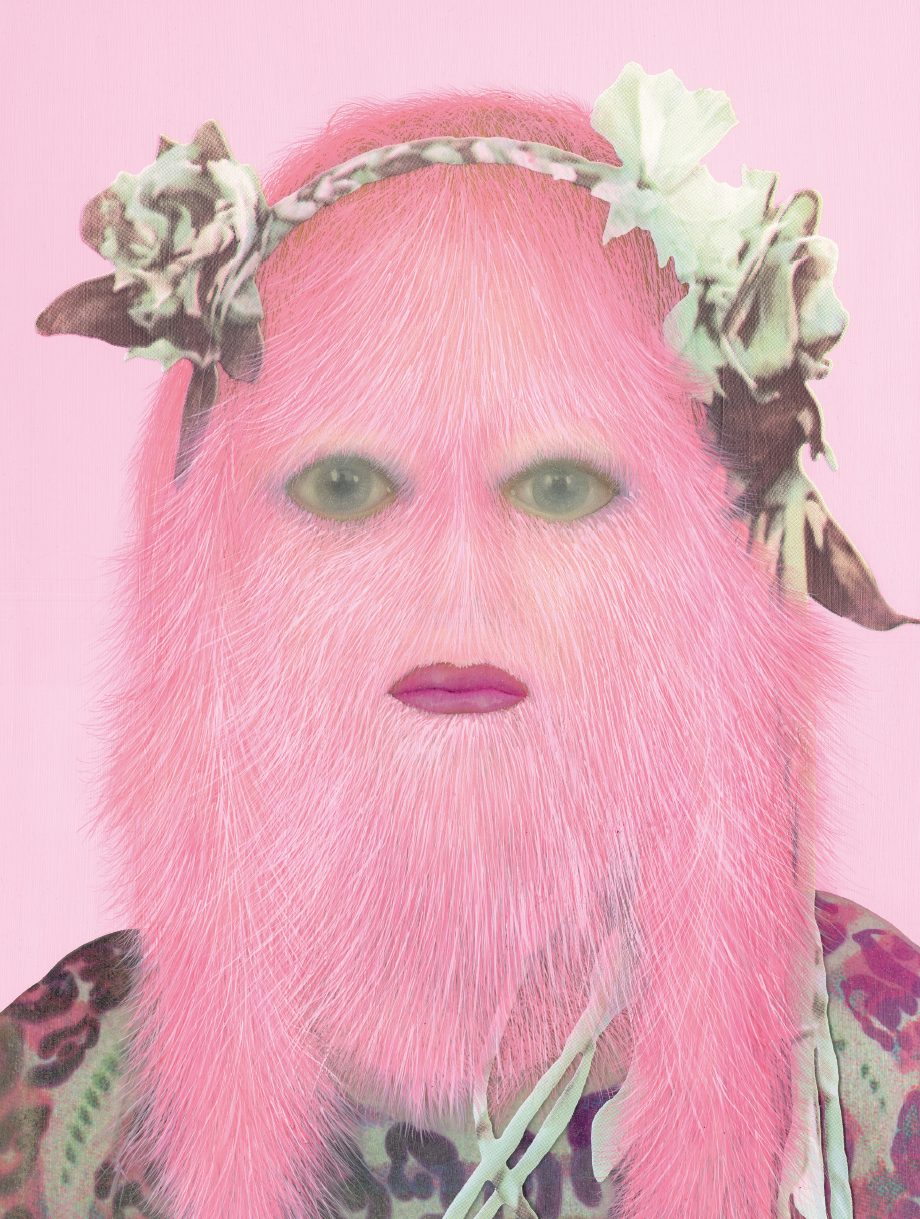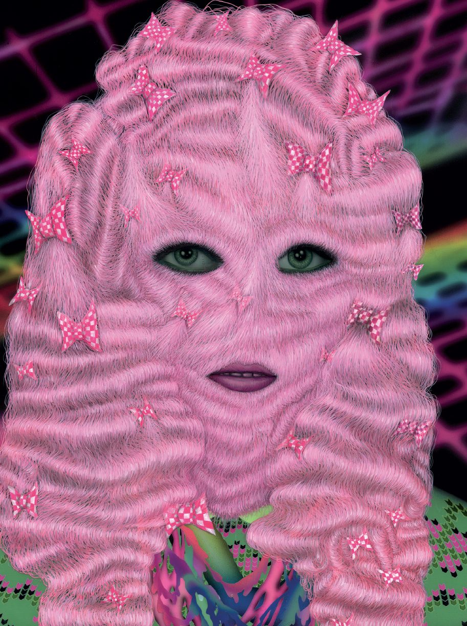 In “Girl with Sunset,” pink hair covers almost the entirety of the head—only the character’s eyes and mouth are fur-free—and sweeps back into the sides as if it has been windblown. In “Rapala” (2016), a man and woman cruise in a BMW. Black hair knots up on their faces. The characters are just human-like enough to become relatable creatures.