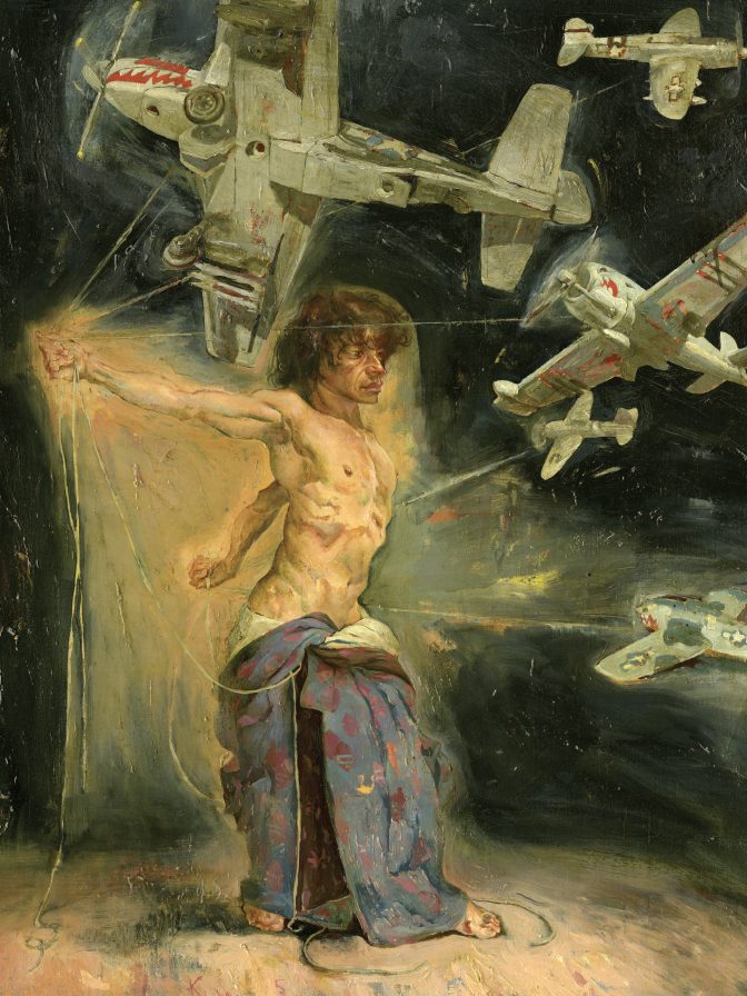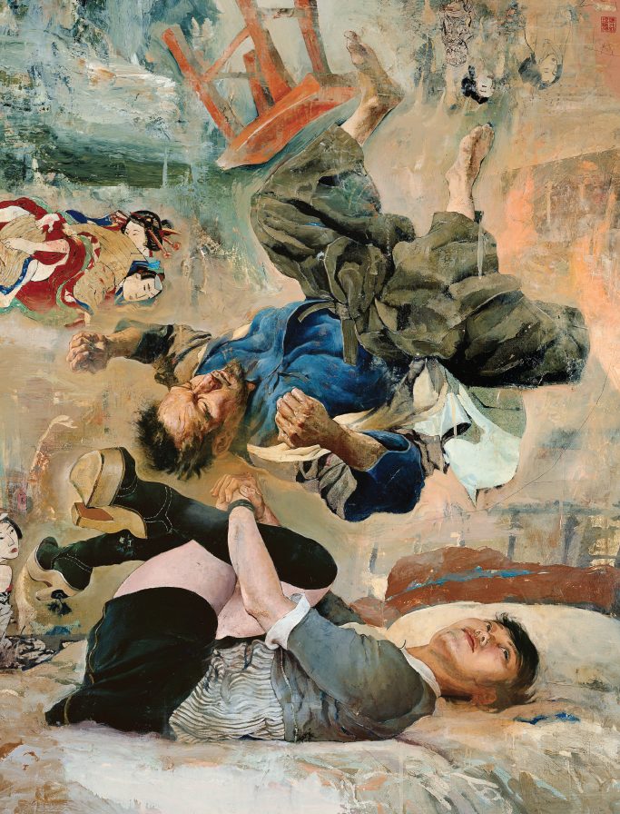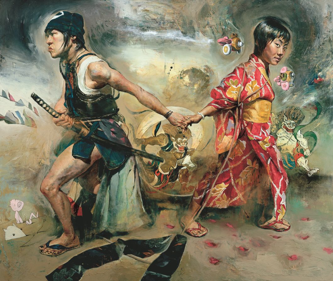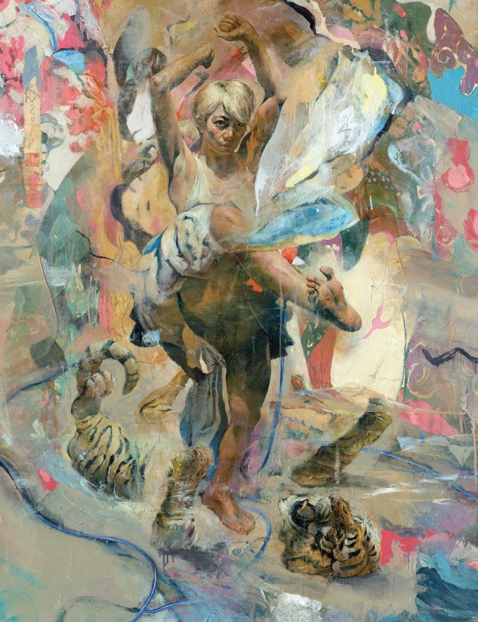 Around the two is a hallucinatory world wherein she is indoors and he out. A stream of paint runs by his foot while a scorpion scampers across her bedsheets. Traditional Japanese ukiyo-e inspired imagery wavers on the outer extremities like faint memories reappearing in the subconscious. Subtle hints of violence and pain found in the deadly arthropod and varicose rivers running down his arms are fully realized by the lunging tiger engulfing the male figure’s face.