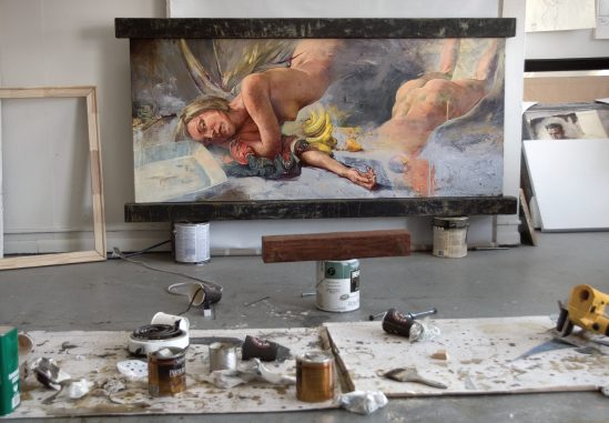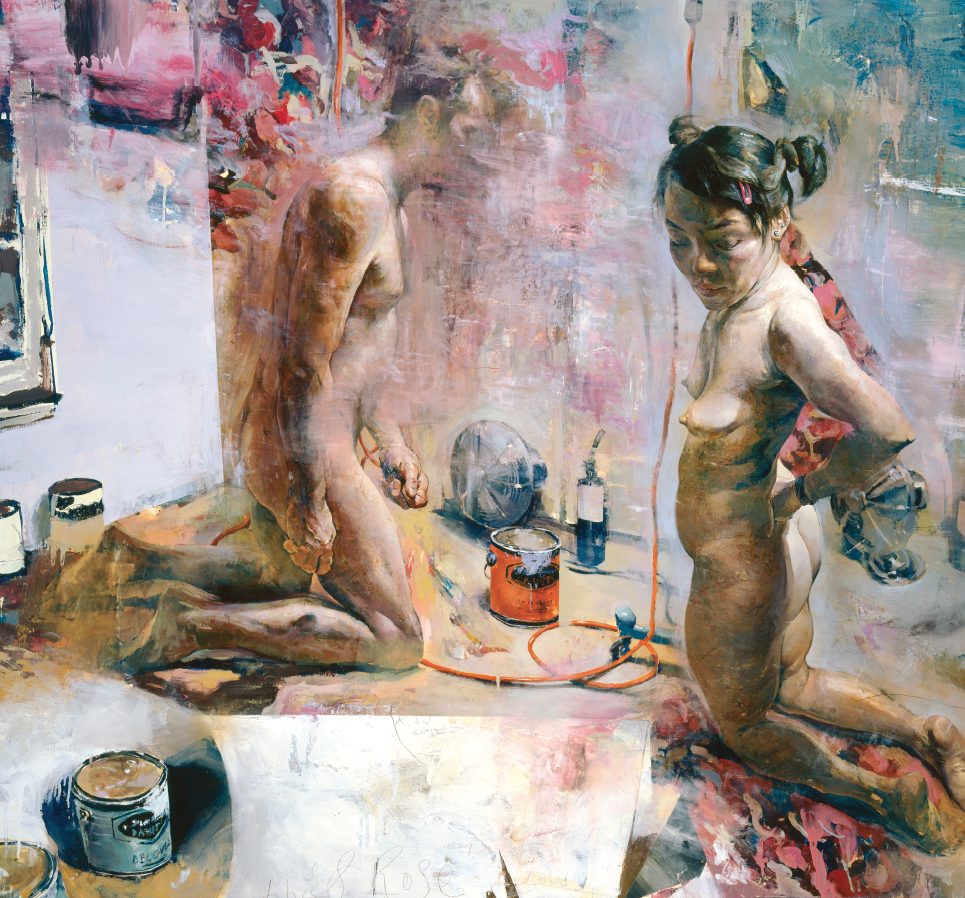 Natalia appears throughout Williams’ recent works with such frequency that the artist has referred to her as “chameleon like.” Ever changing in style and shape, she flutters across his linen, both literally as that is the canvas upon which he paints, and figuratively as in “Studio Arrangement.” In this work, Natalia remains similarly posed as she is in “Blonde Natalia, Again” and “Blonde Natalia, Paint Can, and Orange Electric Cord.” Many of the same elements from her previous portraits remain constant, the paint cans, the dirty windows, the orange extension cord. Her gaze is unwavering, focused on someone or something in the distance, seemingly unresponsive to the eschewed, nude male behind her. His pelvis thrusts outward, his eyes closed in an expression of either heavenly ecstasy or insurmountable pain.