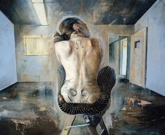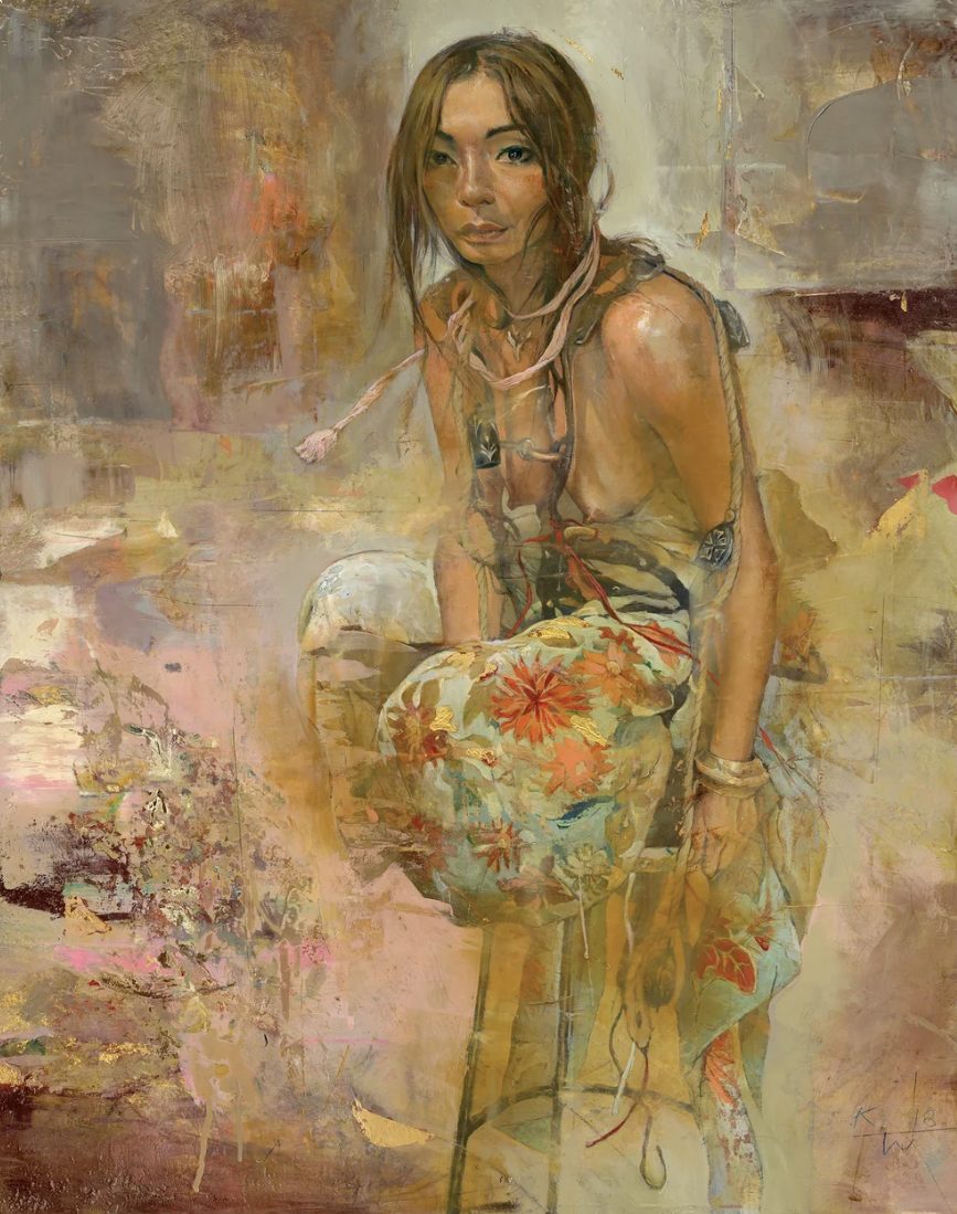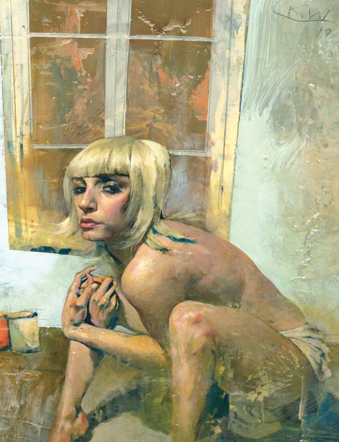Natalia sits hunkered in a barren studio, hands writhing and entangled, hair a platinum blond. Her eyes an uncomfortable combination of seduction and piercing intensity. Around her are scattered the vestiges of any atelier, paint cans and orange extension cords, the window over her left shoulder so muddied from either soot or paint that it seems just as difficult looking out as looking in. The work of Kent Williams is akin to this window: one is never sure whether they are looking into the lives of him and his subjects, or outward to some hazy half-remembered, half-forgotten dream.