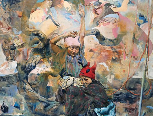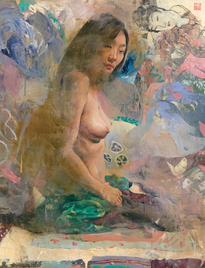 The final interpretation I request is regarding “Convergence: Yumiko.” The painting, even larger than “1962,” depicts a Japanese woman of indiscernible age, laying on a brightly embroidered quilt. Her arms are wrapped around herself though it’s hard to say if they’re doing so to be comforting or to simply be comfortable. Cherry blossom petals melt into shades of pink above her, slowly becoming abstracted in patterned cloth and wayward limbs. An orange extension cord continues upon the journey it began in Sena’s painting, keeping wide breadth of the alligator jaw bone on the bed.