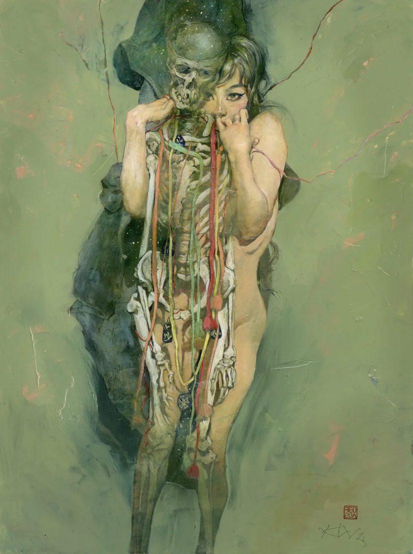 The skeletal remains “can be seen simply as still-life, or it can be reflective of Yumi, her profession and her ability to make statements that are pithy, sharp, and inveterate,” Kent explains, noting that “the model is a PhD and Professor of Philosophy in Boston. She likes
