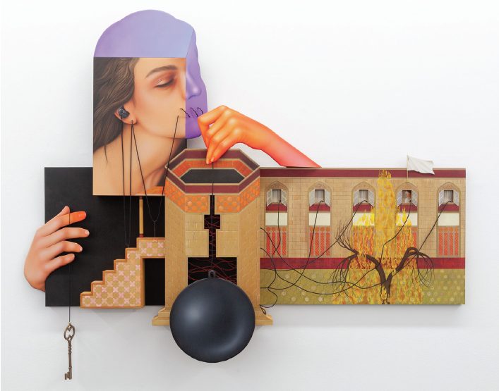 One thing immediately apparent in Khosravi’s work is the immaculate detail and carefully constructed, near-geometric compositions, which echo her early fascination with mathematics and training in graphic design. Another element that specifically influences her style are Persian miniatures, which are meticulous paintings on paper, often featuring allegorical figures within decorative backdrops. In such works there is also an overarching usage of architecture, which serves as both a narrative and compositional trait. This characteristic, coupled with the fact that Khosravi’s father was himself an architect, undoubtedly plays a big role in the way that she creates her own compositions. In her version, she uses different sized wood panels to render various planes of perspective.