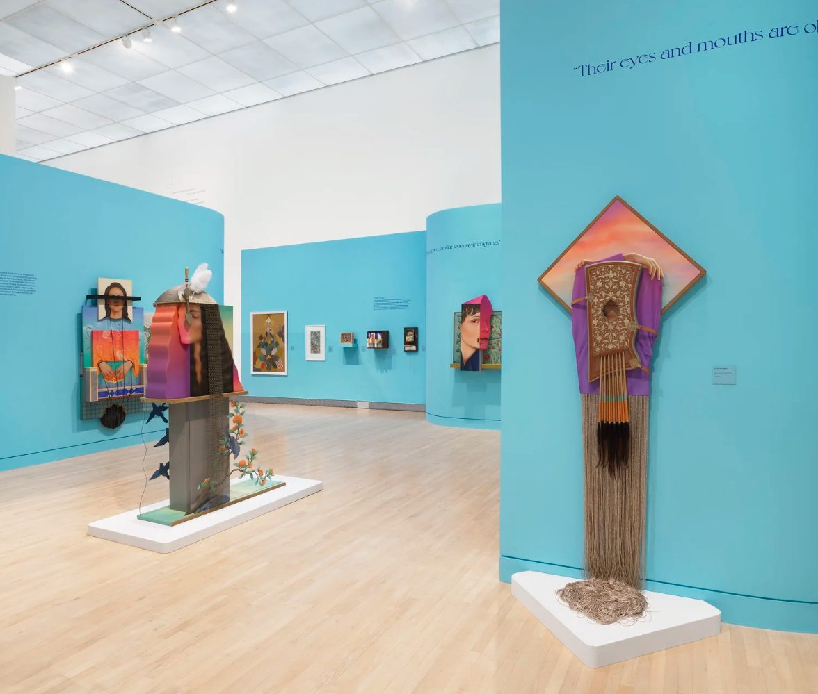 Using striking symbolic language that seems to drift from subconscious realms, Arghavan Khosravi commands the subjects of her vibrant, sculptural paintings. She offers multi-dimensional windows into the lives of Iranian women, whose relationship with their environments is in a perpetual state of quandary. At first glance, one might be struck by the pleasing, almost comforting beauty of these works. Yet this impression is quickly rattled by the startling imagery evoked from her melancholic concepts. Through these scenarios, conflicting feelings emerge: of brutality and elegance, of defeat and triumph, of discordance and tranquility. With numerous panels of detailed paintings juxtaposed in tiers and combined with physical objects, there is a lot to take in.