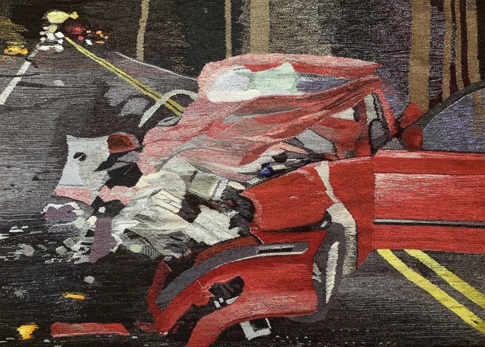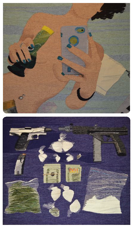Erin M. Riley, an artist out of Philadelphia, is urging you to really rethink your notion of weaving and looming by transforming it from traditional to anything but. At the core of loom work, for centuries upon centuries, it has been about telling a story. And yes, Erin M. Riley is every bit a storyteller. It’s just that these stories are darker and much more complex than you may be used to seeing. Overdoses, car accidents, and explicit selfies are all fair game to Riley and there is a reason for this. She wants to shock, but she implores you not to turn away.